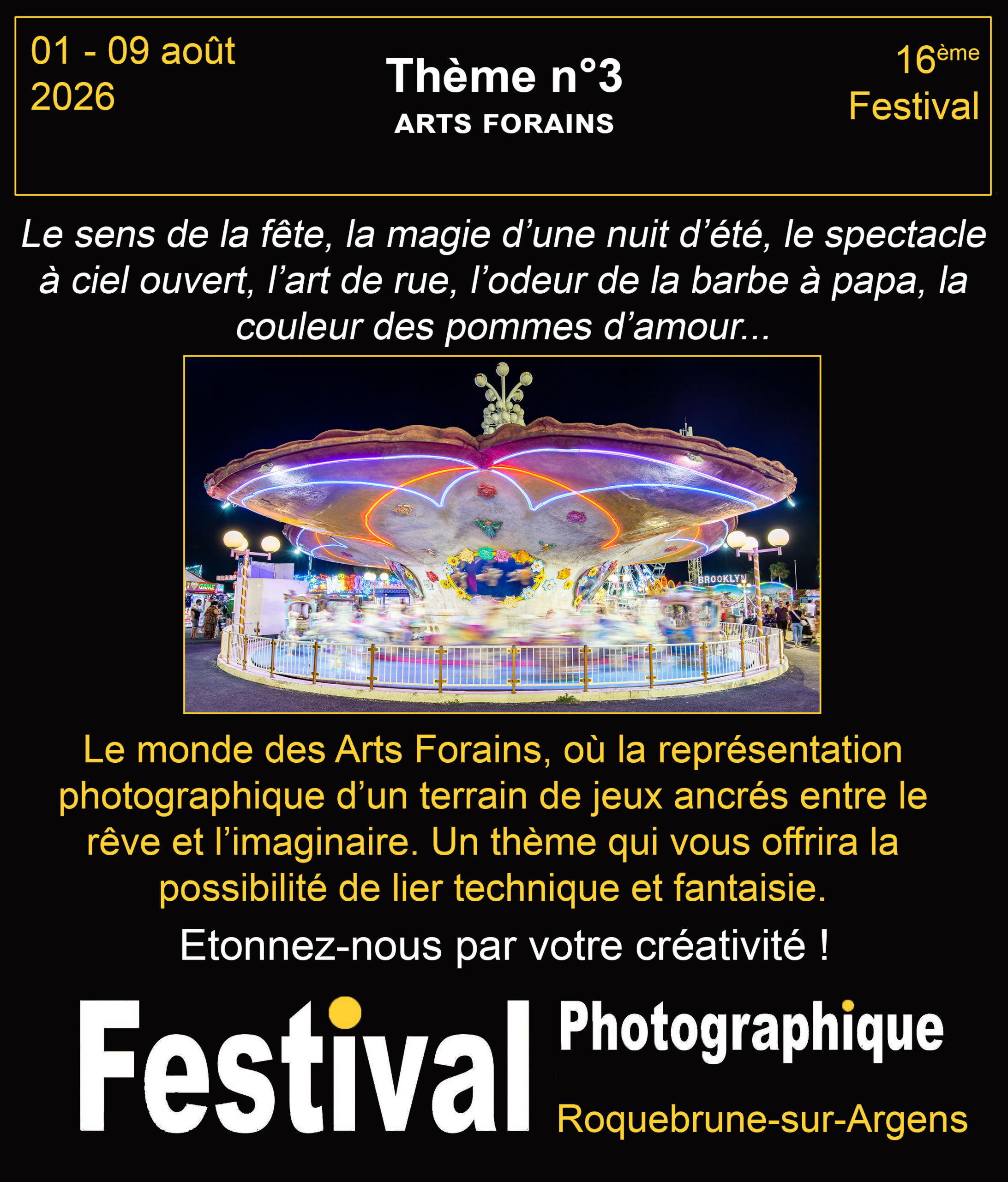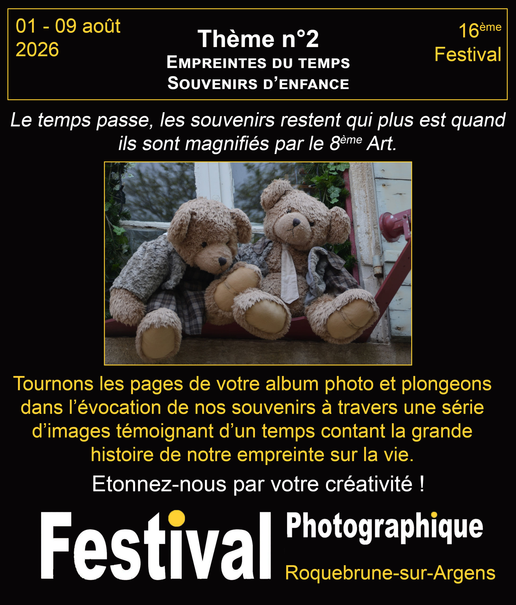 Les thèmes des concours cette année sont : « Emotions » ; « Empreintes du temps, souvenirs d’enfance » et « Les arts forains »